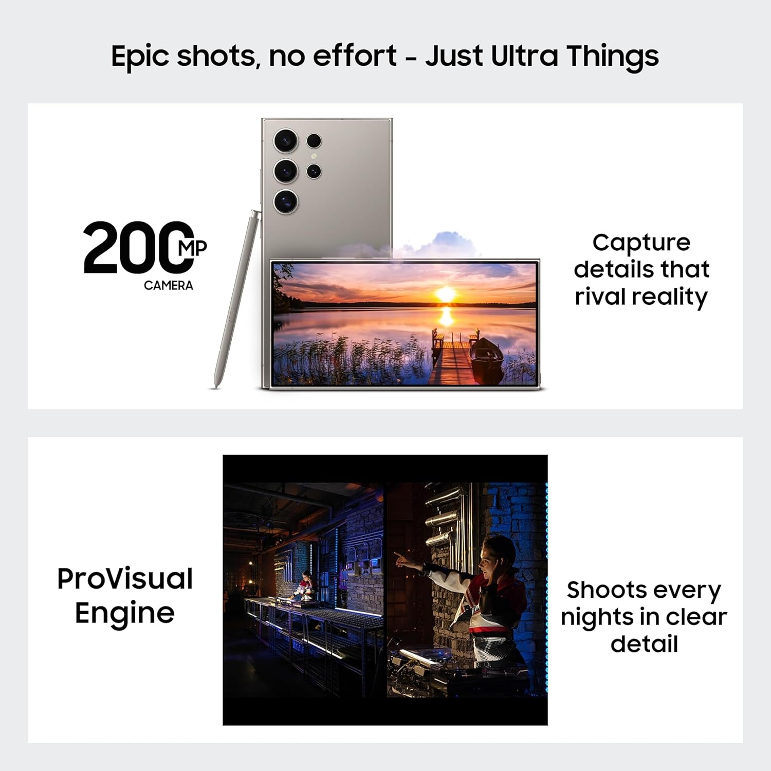 • Epic Camera – With the most megapixels on a Galaxy smartphone ever (200MP) and AI processing, Galaxy S24 Ultra sets the industry standard for image quality every time you hit the shutter. Also, the new ProVisual engine recognizes objects, improves color tone, reduces noise and brings out every detail.